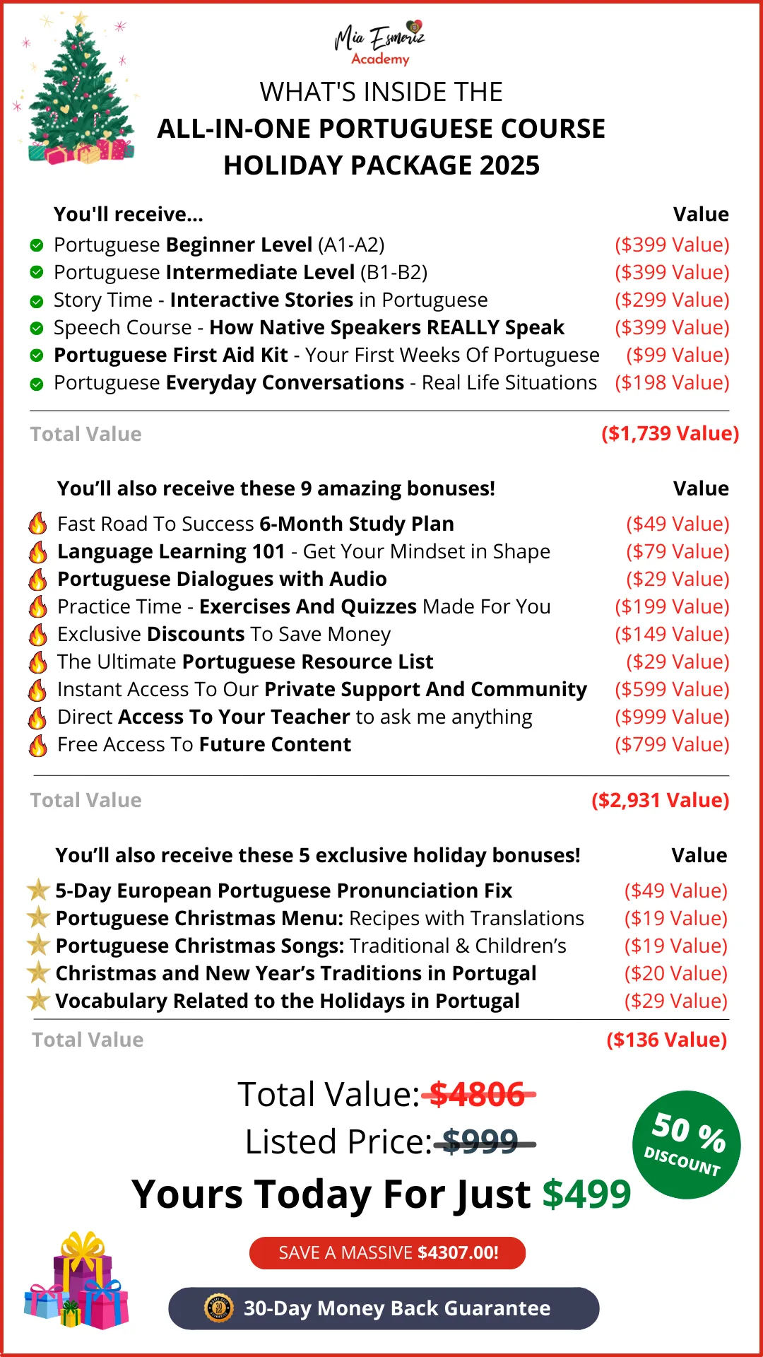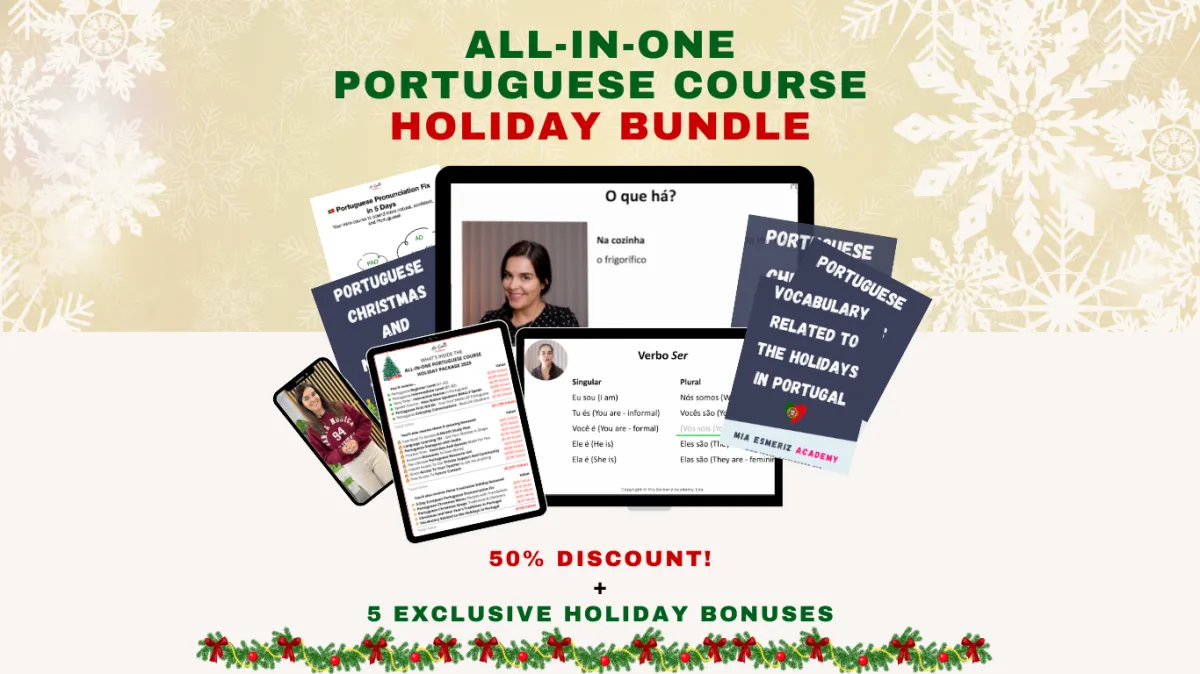 Join The All-In-One Portuguese Course with a 50% discount (biggest sale of the year!) + get 5 extra exclusive bonuses.